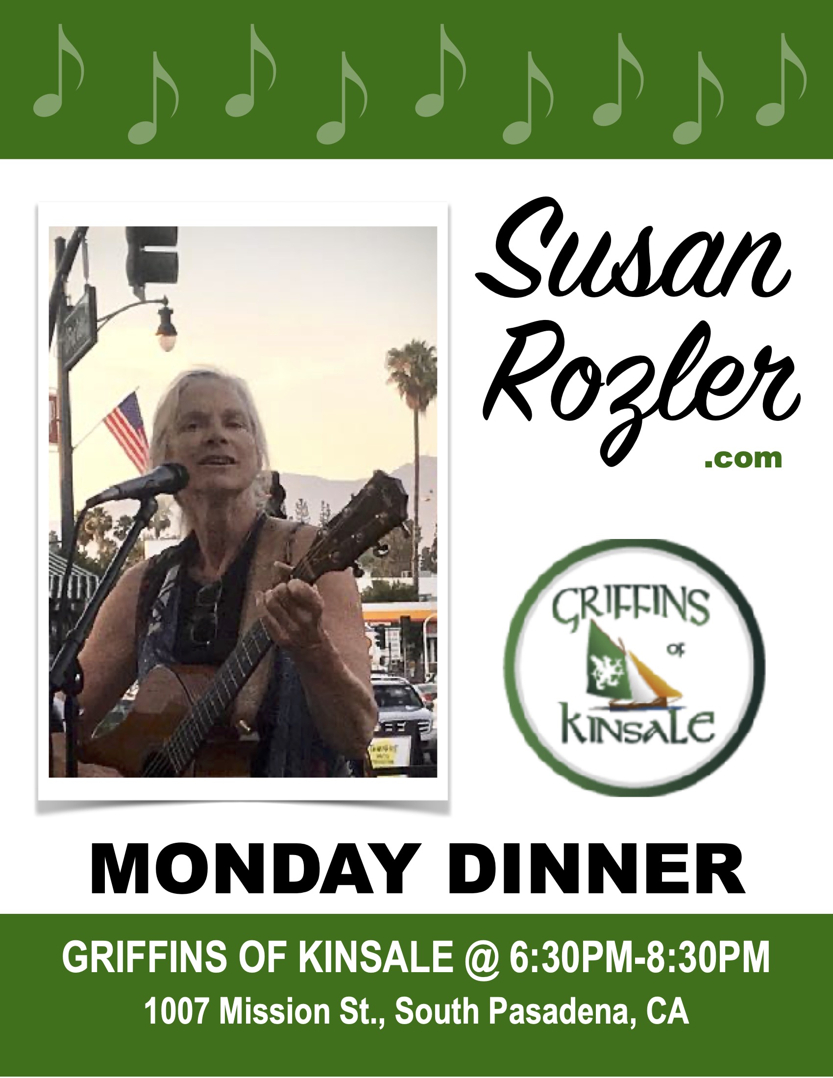 Enjoy Monday Dinner & Music @ Griffins with Susie 6:30pm – 8:30pm Join Susie for great music and the best food ever every Monday at Griffins of Kinsale, 1007 Mission St., South Pasadena, CA 91030. Music begins at 6:30pm. See you there!
