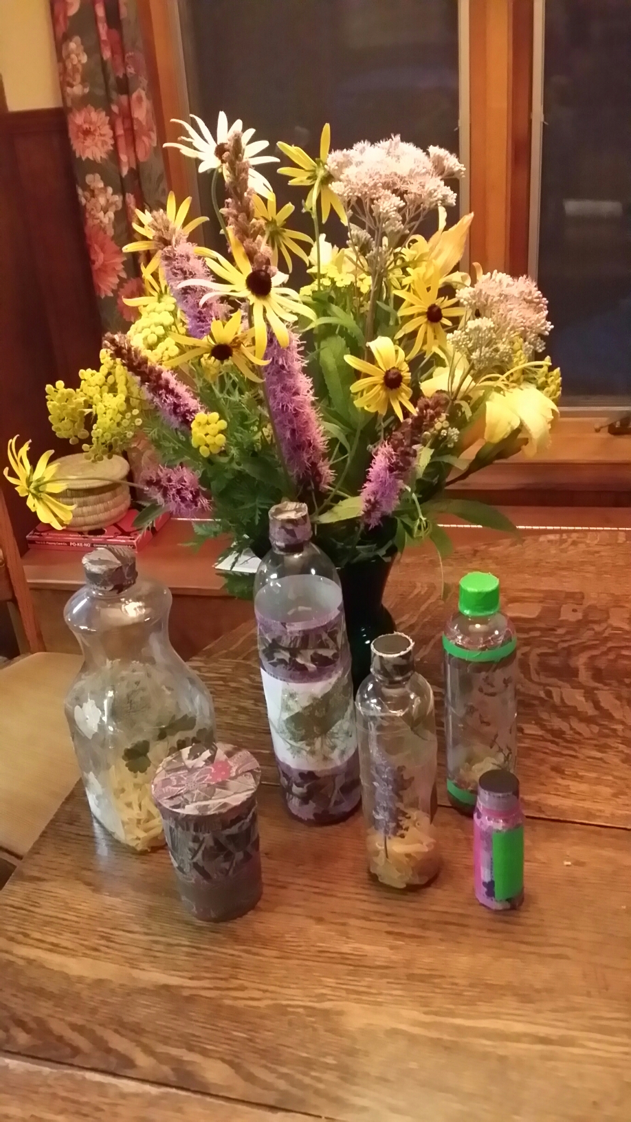 Tansy,Liatrus,Day Lilies and Black Eyed Susan with pressed flowers and recycled bottle shakers.